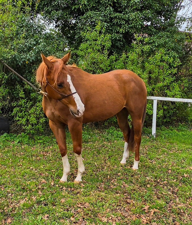 • wächst im Offenstall/Weide in einer kleinen Stutenherde auf